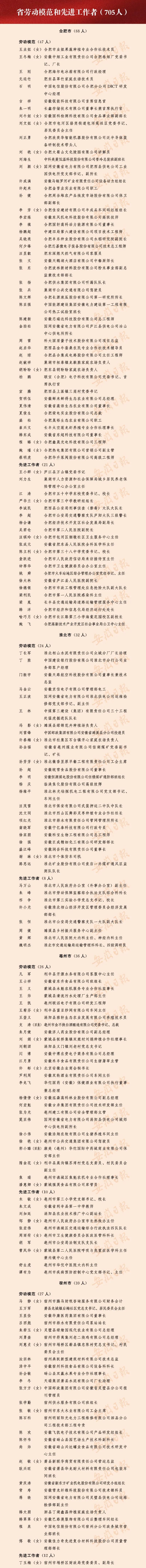 今年是五年一次的省勞動模范、先進工作者和先進集體評選表彰年,經基層推薦、集中審核、征求意見、省級公示等程序后,我省表彰705名省勞動模范和先進工作者(490名省勞動模范、215名省先進工作者),98個省先進集體。